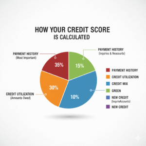 Payment history makes up 35% of your score. Paying bills on time builds trust with lenders, while missed payments lower your score. Consistent, timely payments are key to maintaining good credit.